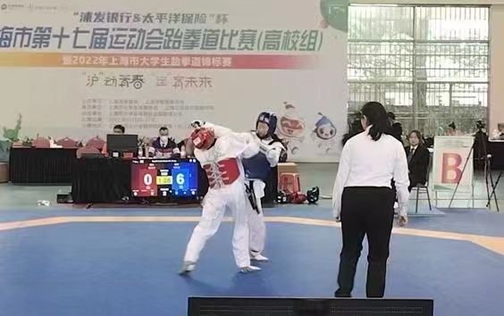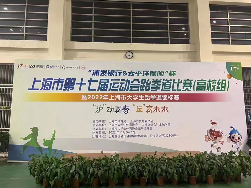2022年11月26-27日,上海市第十七届运动会(高校组)跆拳道比赛在上海立信会计金融学院举行,共有24 只高校队伍参与了角逐。我校跆拳道队15名队员们在领队杜海鹏老师、校队教练丁响老师的带领下奋勇拼搏,不畏艰苦,最终取得了2枚金牌、1枚银牌、4枚铜牌、3个第五名及品势团体总分第一名的好成绩。