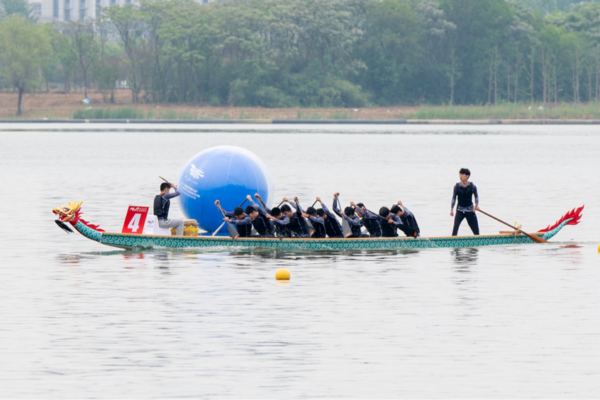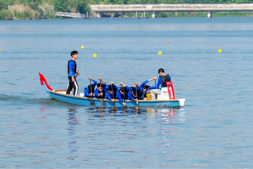 2日上午9点,阳光洒在湖面上,波光粼粼,仿佛为龙舟比赛铺就了一条条金色的赛道。上海海事龙舟队员们身着整齐的队服,精神抖擞,蓄势待发。随着裁判一声令下,龙舟如离弦之箭般冲出起点,迅速划向终点。获得B组小组赛第一,成功进入决赛。