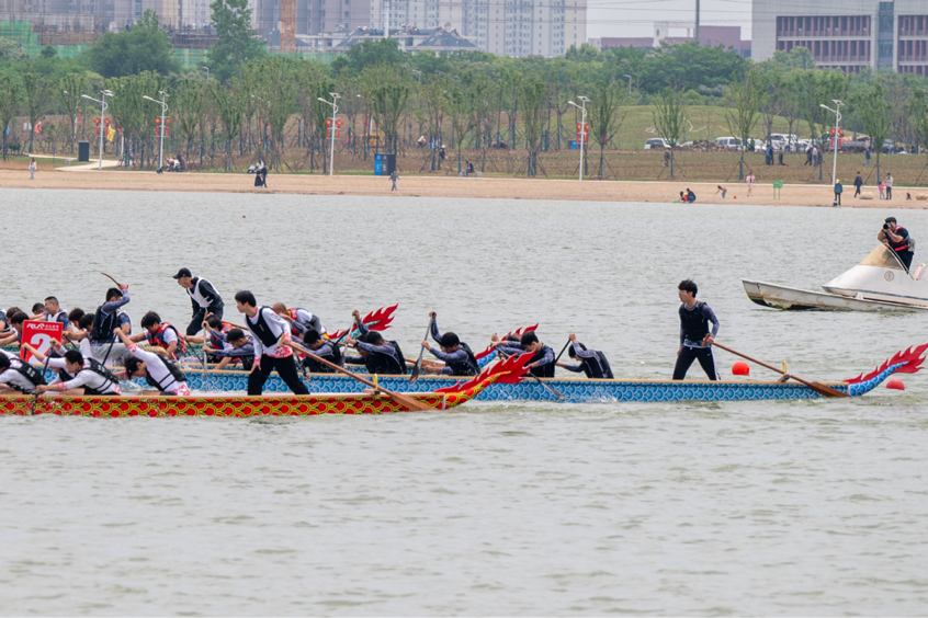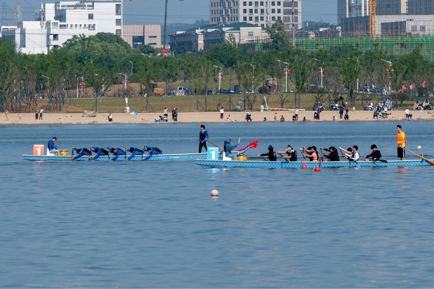 在决赛中,队员们配合默契,动作协调一致。他们挥舞着手中的船桨,每一次划水都充满力量。他们的目光坚定、齐心协力,共同为着目标努力。比赛现场,队员们奋力拼搏,岸边观众喝彩连连。