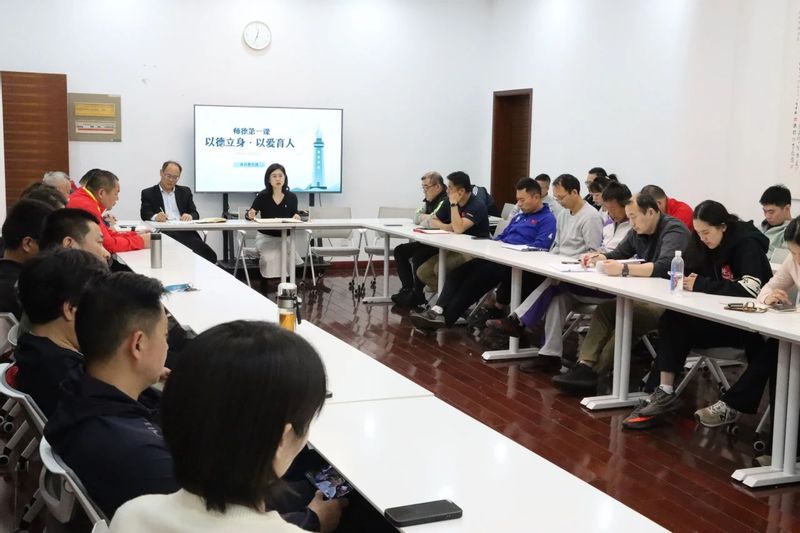 为深入学习贯彻《教育强国建设规划纲要(2024—2035年)》和《关于健全新时代师德师风建设长效机制的意见》精神,切实加强教师队伍思想政治建设,4月16日中午,体育教学部在体育馆A102开展“师德第一课”专题学习。会议由直属党支部书记马莹主持,全体教职工参会。