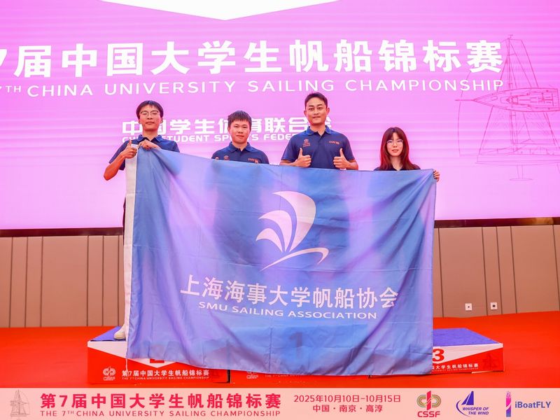 在竞争激烈的FE18r型龙骨船级别中,十六支劲旅展开四天鏖战。在体育教学部年轻教师池浦研的带领下,由吴国浩(船长、舵手)、吴思颖(缭手)、刘晓霞(前甲板)、沈长乐(中仓)组成的上海海事大学代表队,历经三轮分组赛与三轮决赛的考验,沉着应对多重突发状况,最终从诸多强队中突围,勇夺全国第六名!
