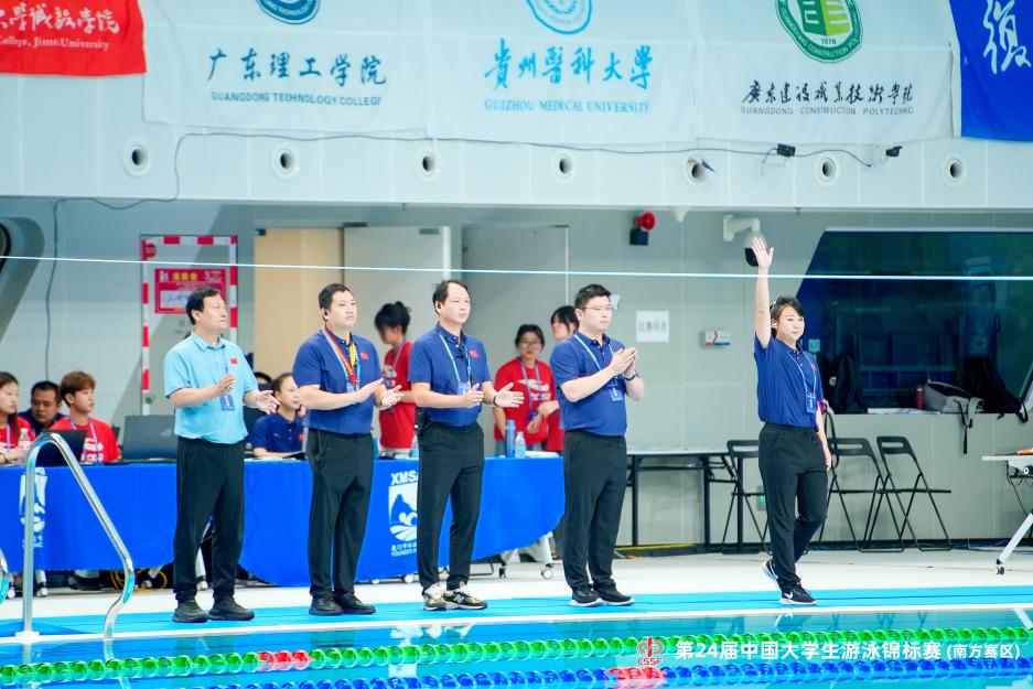刘娜老师同样受邀执裁第24届中国大学生游泳锦标赛(南方赛区)。作为国家级游泳裁判员和发令员代表,她在开幕式上作为裁判团队成员宣誓,并在赛事中精准把控发令环节,以严谨的态度和专业的表现履行裁判职责,其专业素养获得了赛事组委会与各参赛高校的广泛认可。